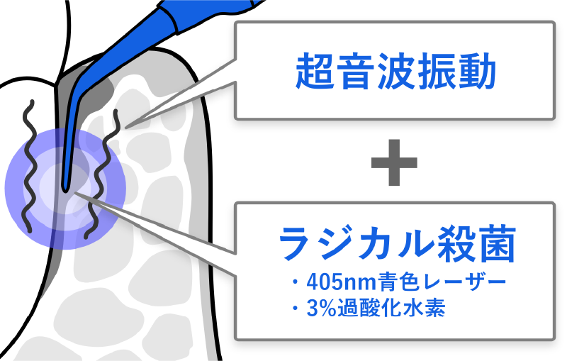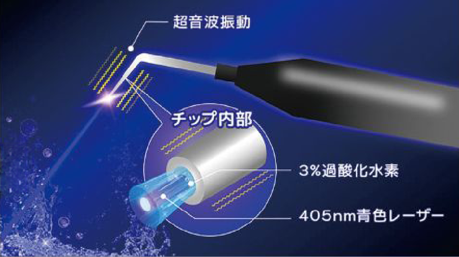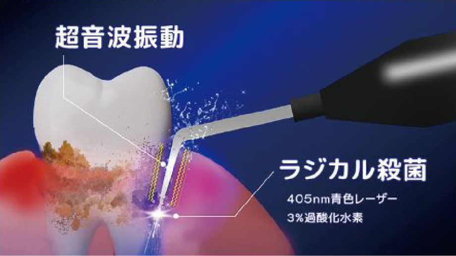 を誘発することにあります。さらに、これを従来の超音波振動と組み合わせ、進行した歯周病の歯周ポケット内で同時に作用させることで、歯周病の原因菌を効率よく殺菌・除去 します。