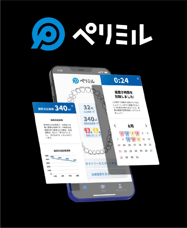 コミュニケーションアプリ「ペリミル」は、根本的な解決方法を目指し、患者様が自分自身の口腔内に興味を持ち続けられるよう習慣化を支援します。