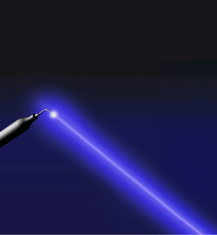 過酸化水素にレーザー青色光を照射し、活性酸素(ラジカル)を発生させることで、歯周ポケット内の細菌を減少させます。