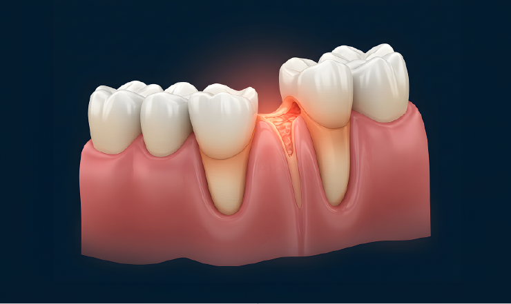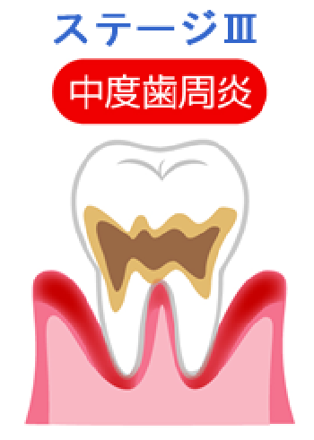 歯周炎(ししゅうえん)になります。この段階では、歯ぐきの炎症がさらに悪化し、歯を支えている骨が溶け始めます。歯ぐきが下がり、歯が長く見えるようになったり、口臭が強くなったりするのが特徴です。また、歯と歯ぐきの間に「歯周ポケット」と呼ばれる隙間ができ、そこに細菌が入り込むことで症状がどんどん進行します。