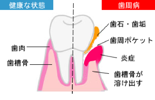 歯みがき不足や不適切なケアによって、歯垢がたまり歯石に変わると、細菌が繁殖し歯周病を引き起こします。