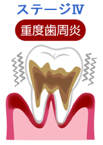 重度の歯周病になります。この段階では、歯を支える骨がほとんど溶けてしまい、歯がグラグラと動くようになります。食事のときに噛むのが痛くなったり、歯ぐきから膿が出たりすることもあります。最終的には歯が自然に抜けてしまうこともあり、ここまで進行すると元の状態に戻すことは難しくなります。